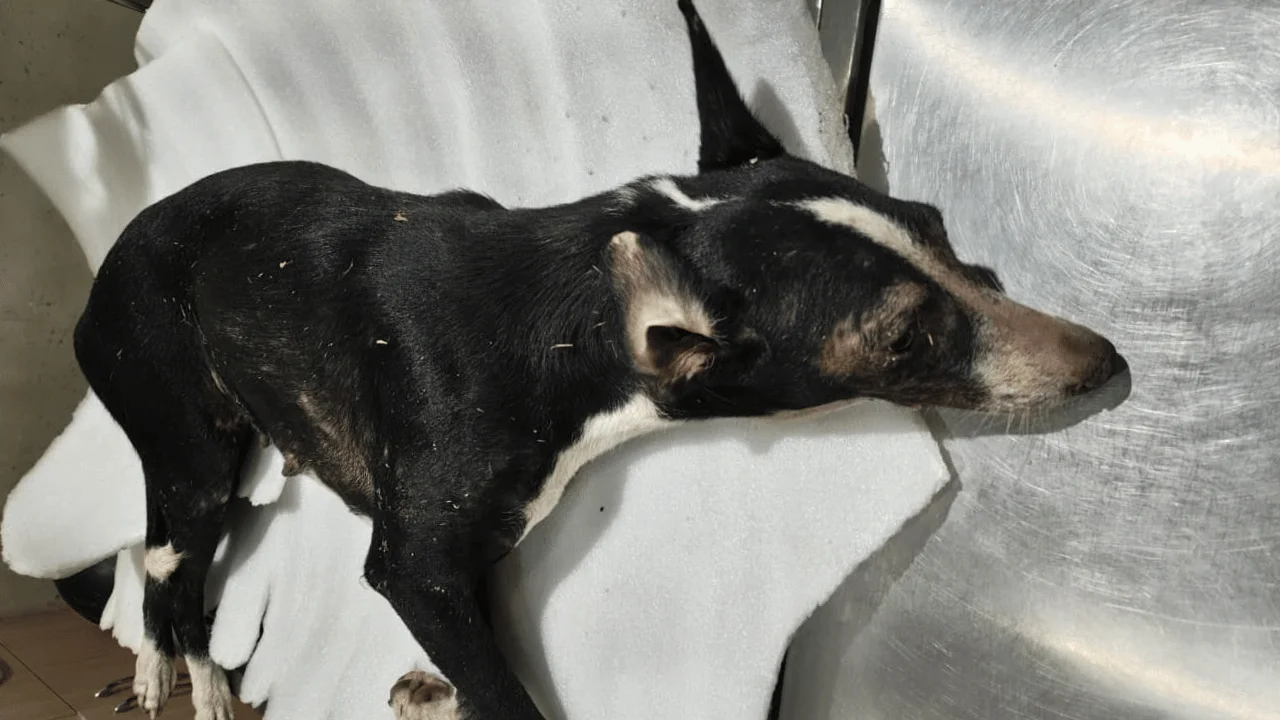 Brut, a brown-colored indie dog, was rescued in a severely distressed state, suffering from a painful rectal prolapse. This condition has left him in immense discomfort, and he is currently under intensive medical care to stabilize and treat the issue.