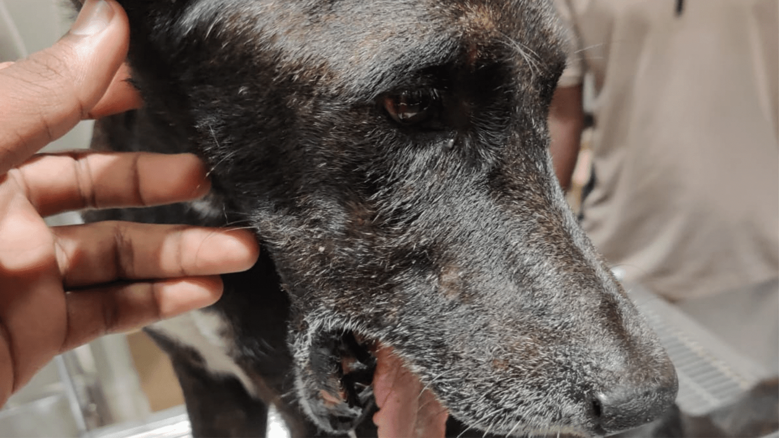 Shadow, a black Mongrel, was rescued on 16th October 2025 with a broken jaw — likely caused by a brutal blow or road accident. He was in immense pain and unable to eat or drink on his own.