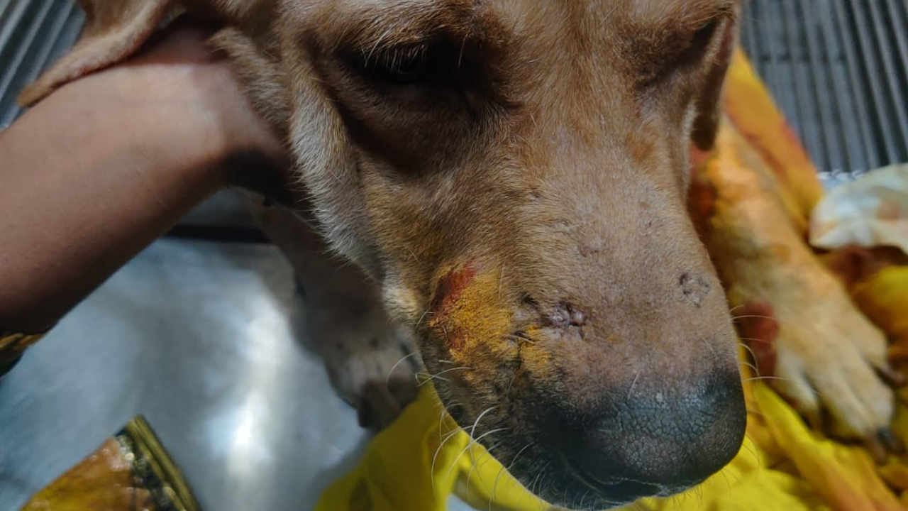 Rascal, a loving stray dog, was rescued on 25 September 2025 with a serious injury on his nose. The wound had already worsened due to infection, causing him immense pain and weakness.