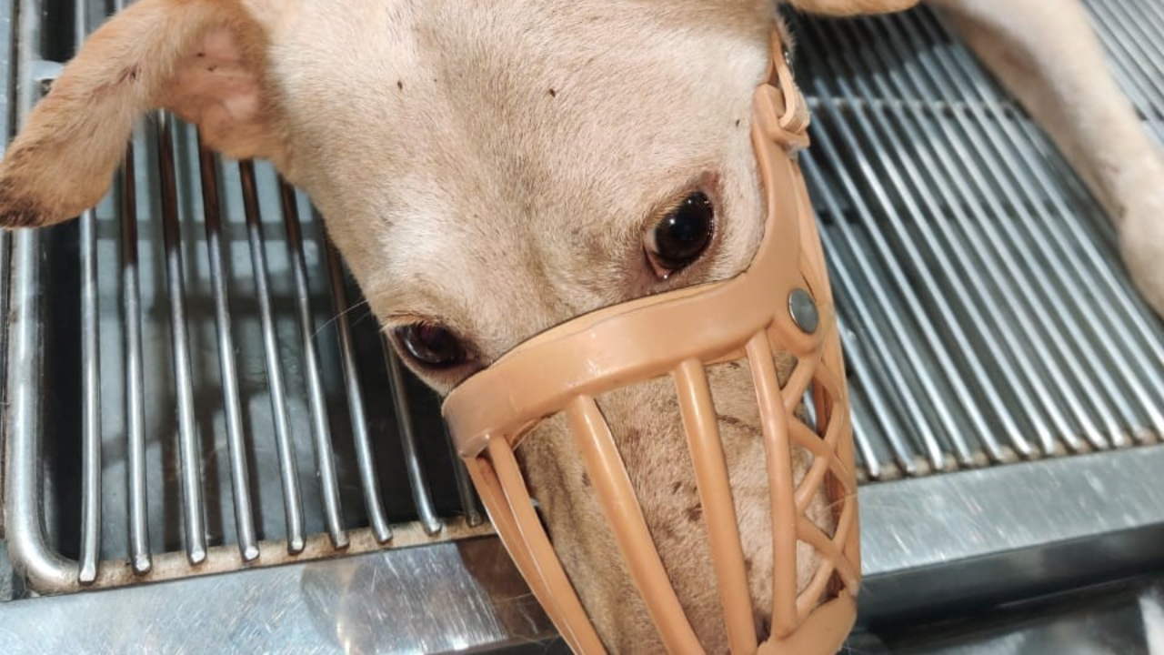 A white mixed-color Mongrel, was found with a severe wound on his nose — likely from a street fight or injury caused by sharp debris. The wound is open, raw, and putting him at risk of further infection.