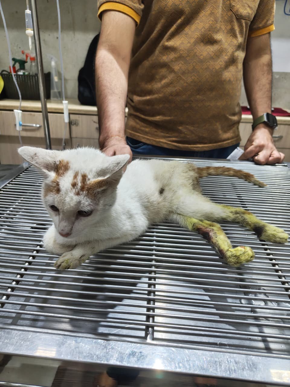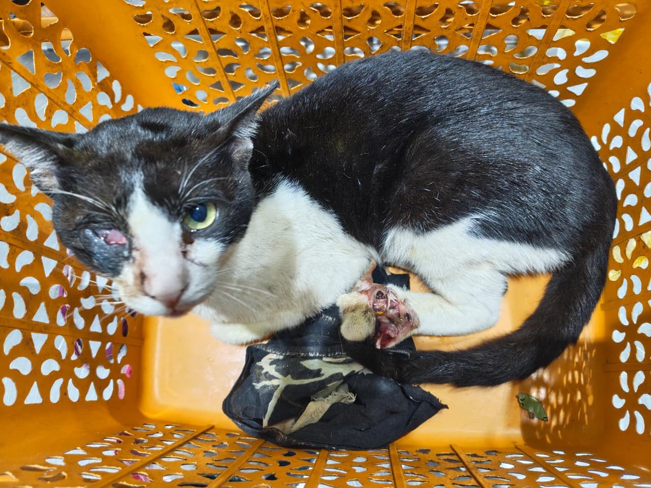 Kalu, a black male DHS (Domestic Short Hair) cat, was rescued with a deep wound on his leg, leaving him in severe pain and unable to walk properly.