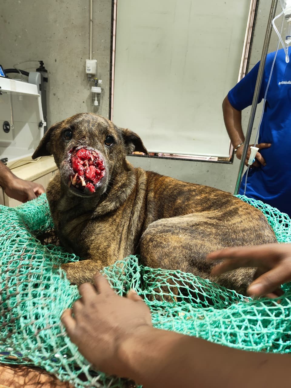 Mari a mixed color female mongrel was rescued in critical condition. She had developed a horrifying maggot-infested wound inside her nose.