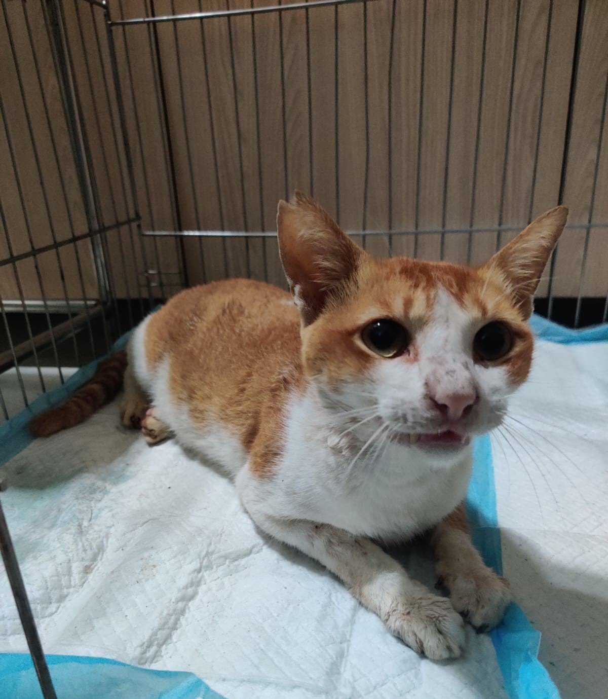 Nova a golden-colored female DHS cat was rescued in severe distress. She was found straining to urinate, crying in pain, and visibly bloated.