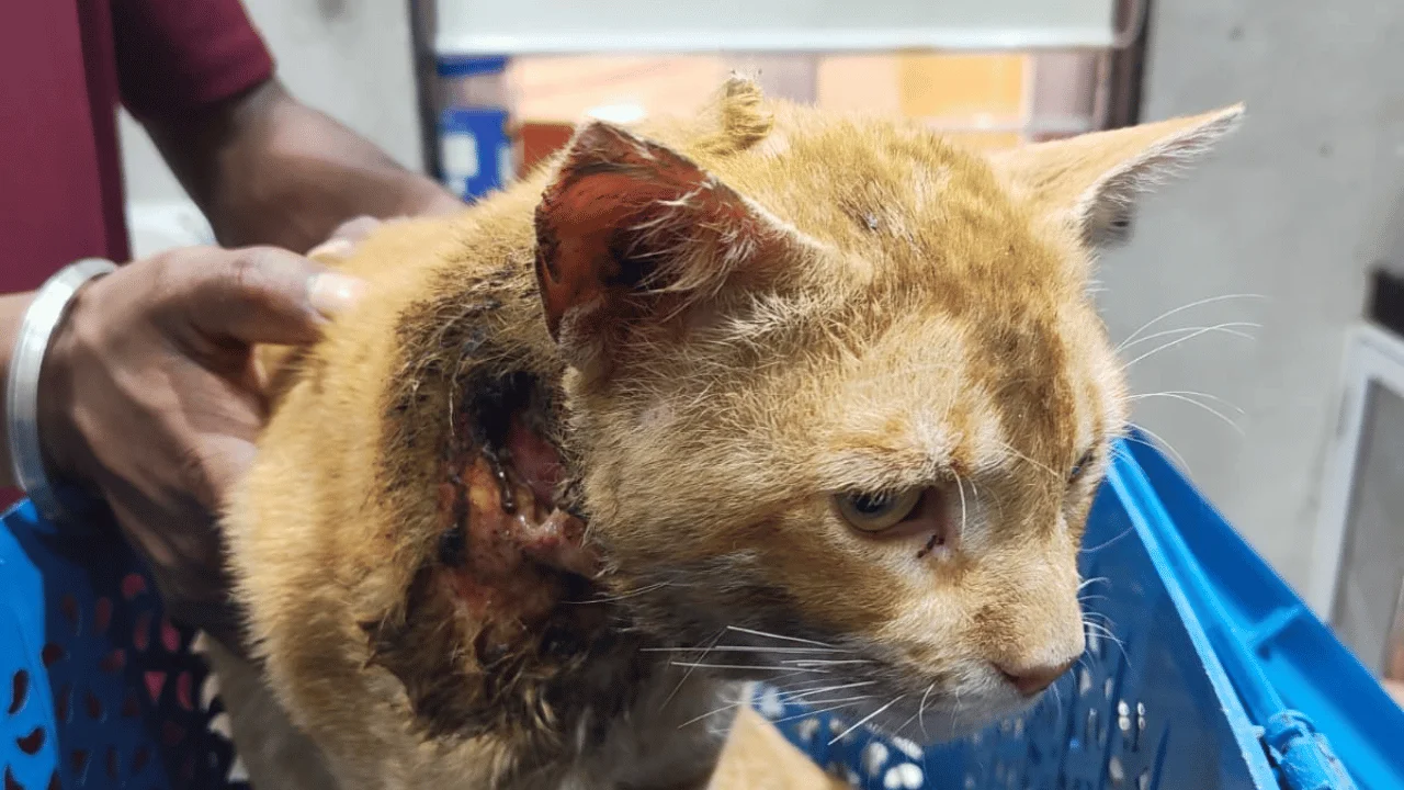A golden DSH (Domestic Short Hair) cat, was admitted with a severe maggot wound on the ear.