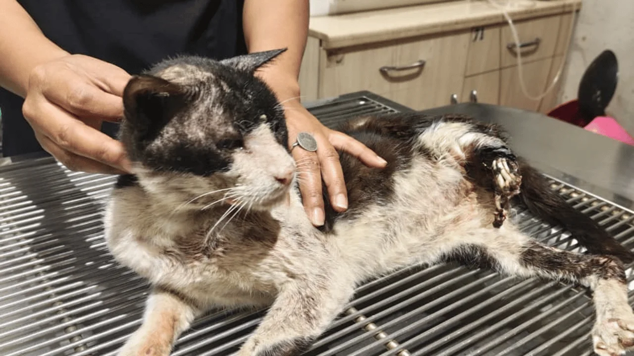A black & white DSH (Domestic Short Hair) cat, was admitted with a serious maggot wound on the leg.