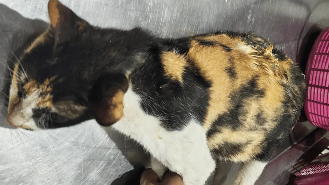 A mixed color DSH (Domestic Short Hair) cat, was admitted with a maggot wound on the back.