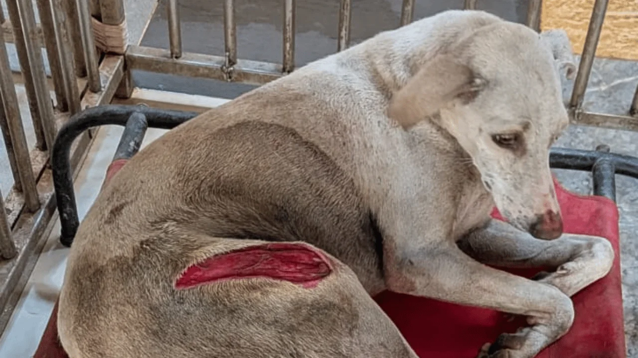 A white Mongrel dog, was admitted after suffering a serious accident injury The impact caused painful.